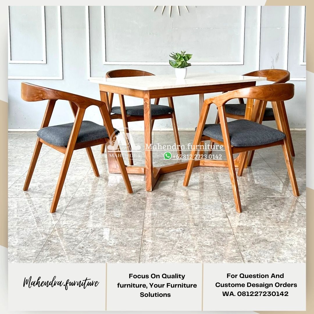 Set Meja Makan Minimalis 4 Kursi Jati Marmer Desain Mid Century – Mahendra Furniture Jepara