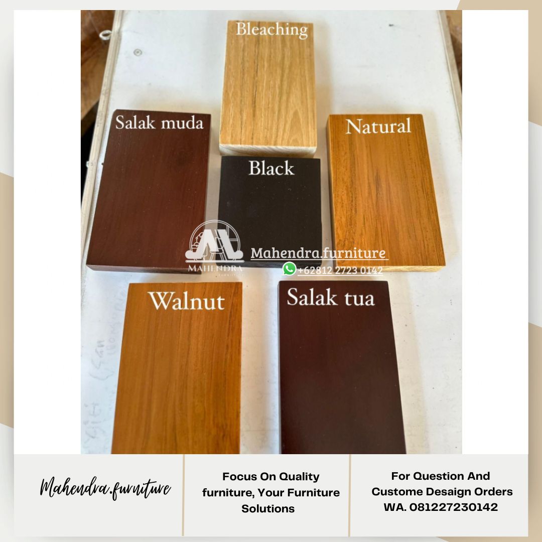 Untuk memberikan fleksibilitas dalam mencocokkan interior Anda, kami menyediakan berbagai pilihan warna frame. Pertama, tersedia warna Natural yang memberikan kesan natural dan hangat. Kemudian, pilihan salak muda menghadirkan nuansa klasik yang elegan. Selain itu, Anda juga dapat memilih Natural untuk tampilan kayu asli, atau Black Duco dan White Duco untuk kesan modern minimalis.