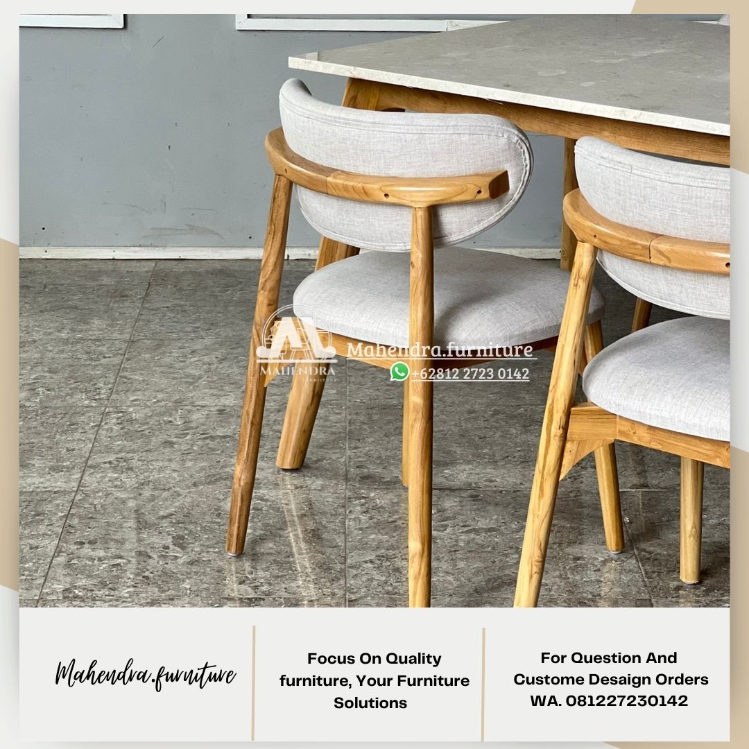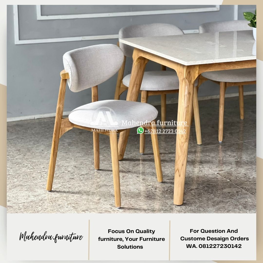 - Material kursi: Kayu jati dengan seat fabric premium (warna cream/putih yang selaras dengan meja)