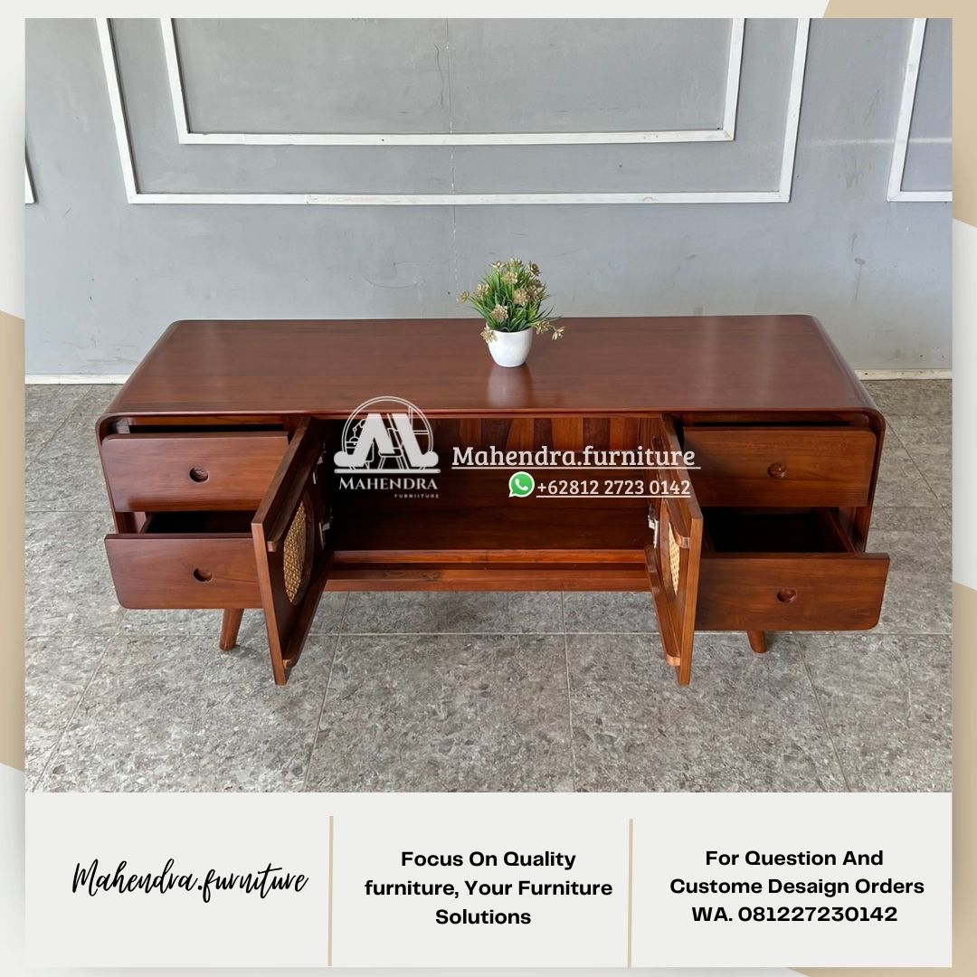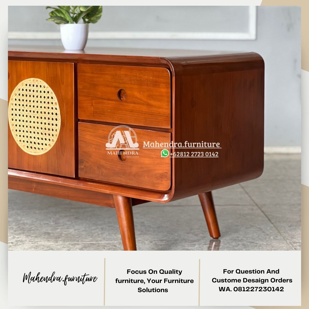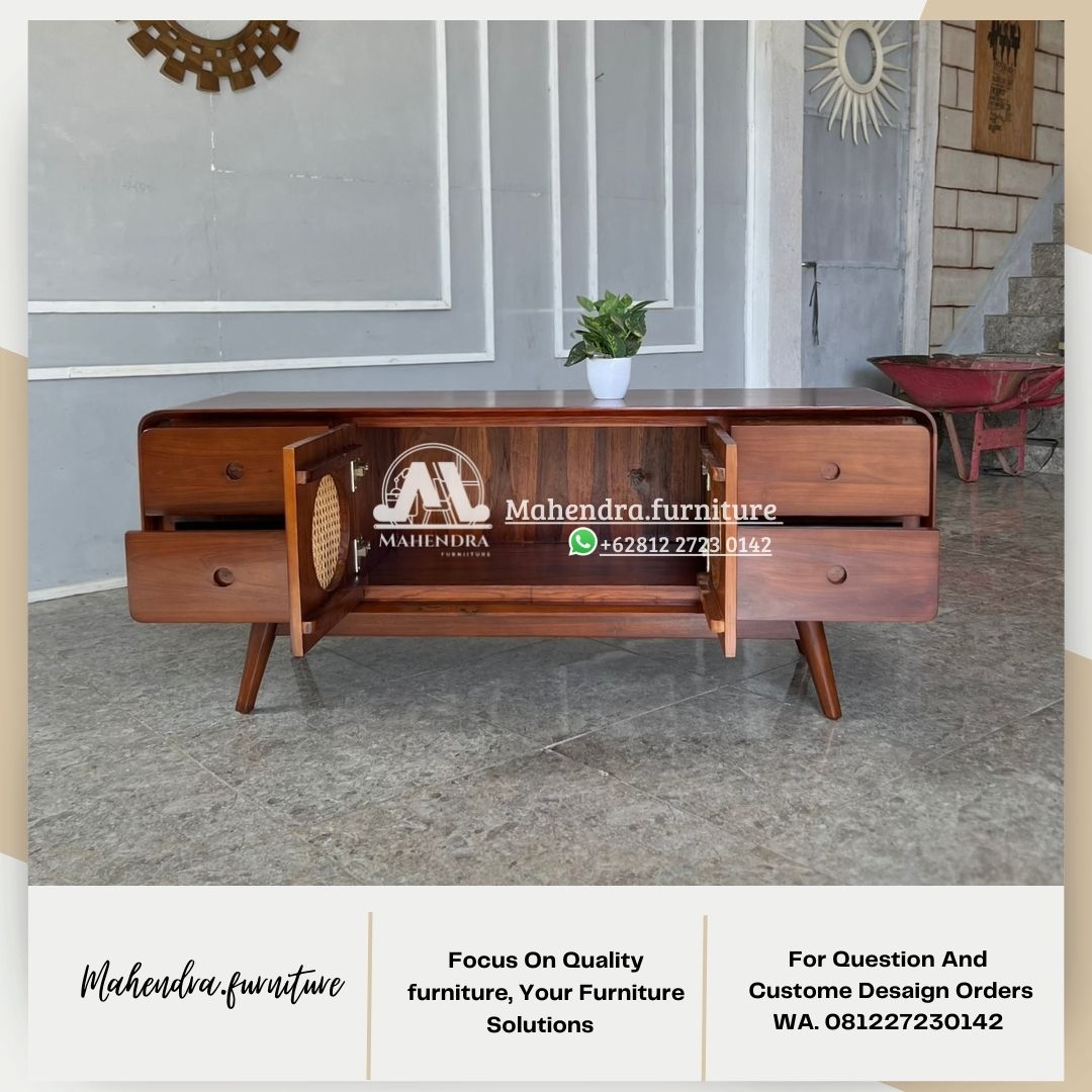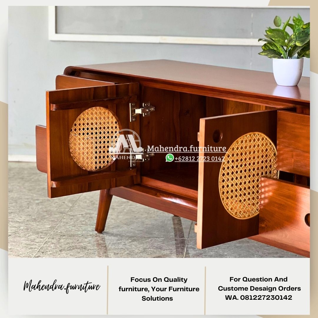 Kabinet Kayu Jati Retro Minimalis dengan Rattan Meja TV Vintage