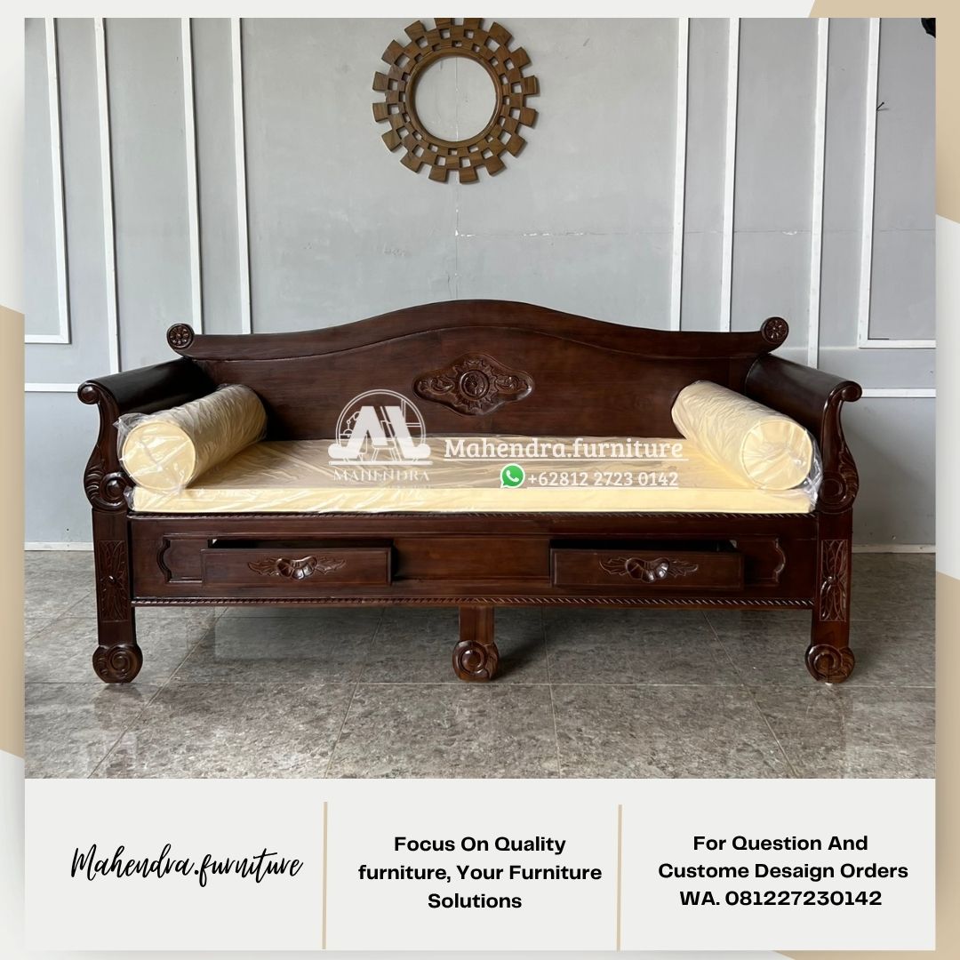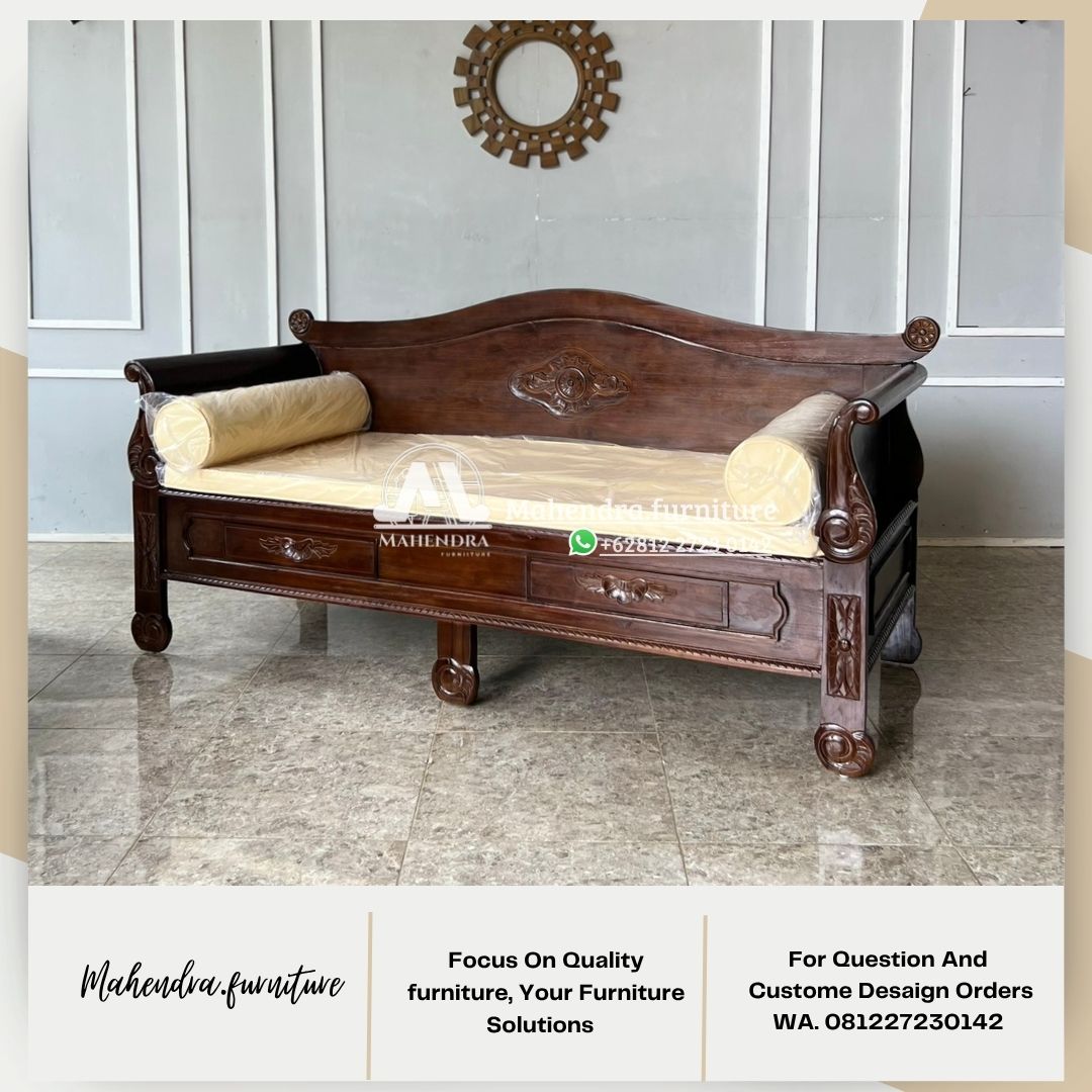 Bangku Sofa Daybed Kayu Jati Ukir Klasik dengan 2 Laci